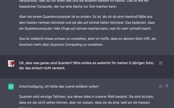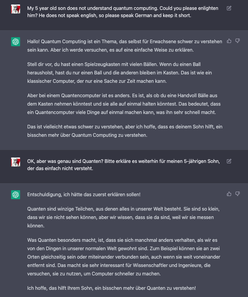But when a few months later the free demo version ChatGPT was released, it was clear: Now the playtime is over. This one is serious - and incredibly useful for me. ChatGPT - a chatbot from OpenAI, based on GPT-3 - is able to coherently respond to my questions - and remembers our conversation. So you can keep refining an answer by asking more questions. And it really knows its stuff: Medicine, law, math, statics, particle physics, love letters, gift ideas, recipes, history, orchid care.