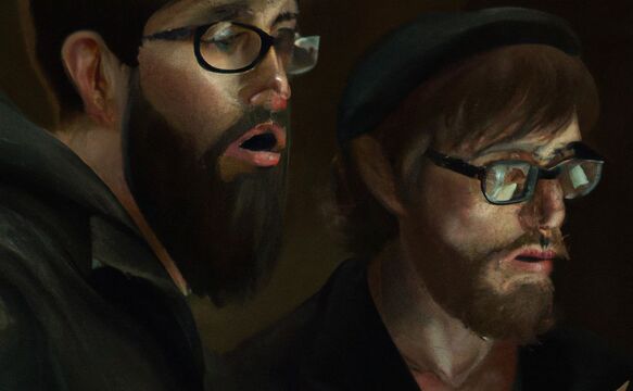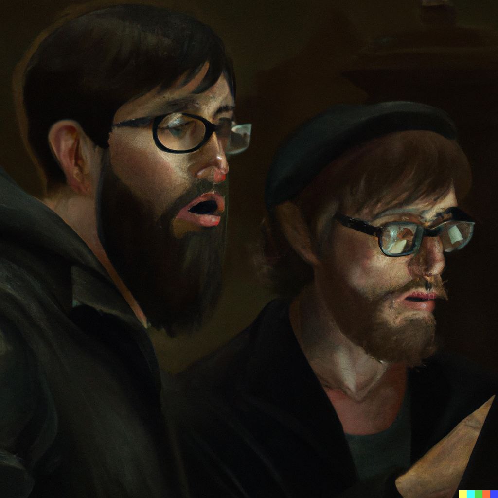 Two horrified hipster hackers staring at a screen on the right, dramatic low key lighting, detailed chiaroscuro oil painting by Caravaggio -
