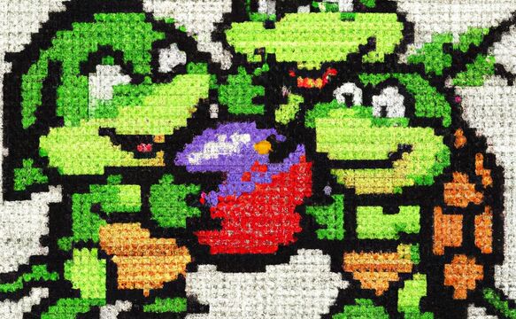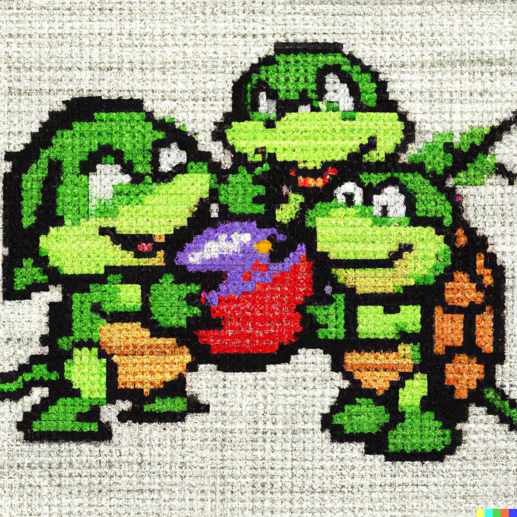 Teenage Mutant Ninja Turtles eating fruit as a cross stitch -