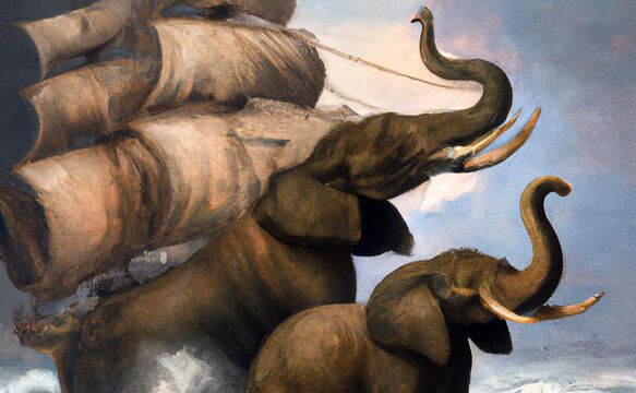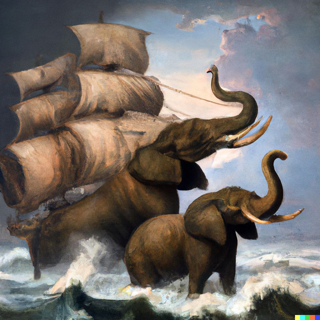African elephants carrying a mighty frigate through stormy seas, painting by a Dutch master