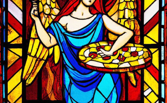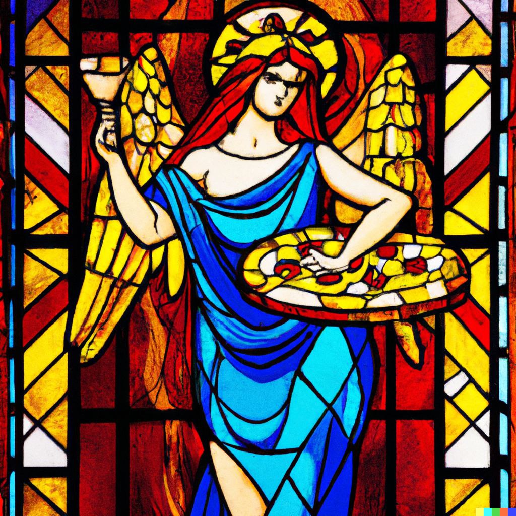 A pizza saint in a church window -