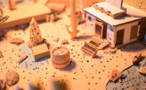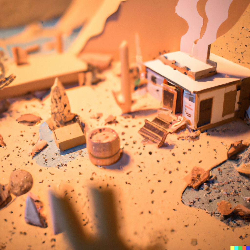 Miniature desert city surrounding a Finnish sauna, papercut diorama -