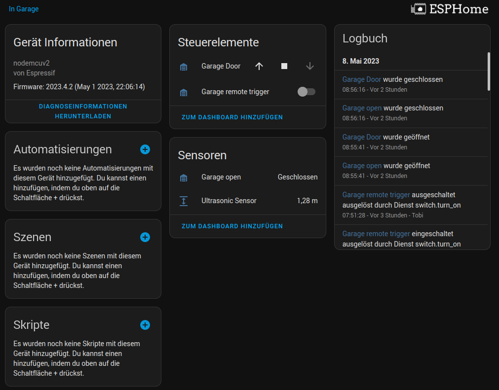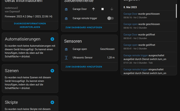 This configuration already includes error handling routines for the inaccuracies of the ultrasonic sensor and the definition that it is a garage door. This is important so that the device is not displayed in Home Assistant as just a switch and sensor.